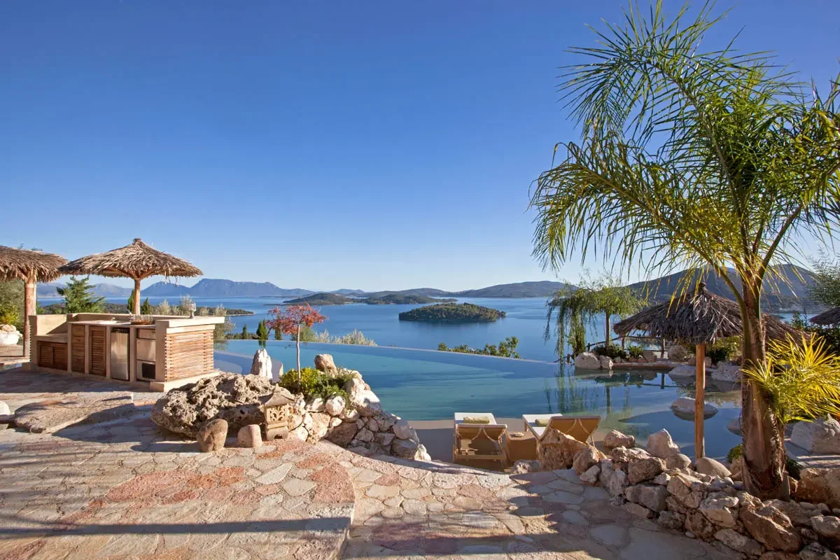 Villas set amongst beautiful lush foliage and ancient olive trees. The rooms nestle discreetly against the mountainside boasting stunning views of the many small islands dotted in the Ionian Sea.